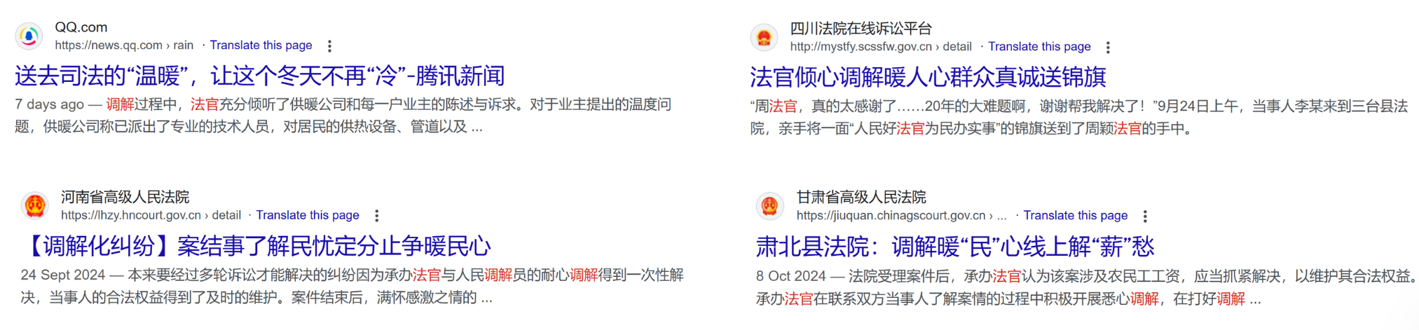 话虽如此,我国对法院调解的推行力度的确相对更强。从“马锡五审判方式”到“枫桥经验”,打开谷歌随手一搜就能找到不少关于法官促进调解的正向宣传: