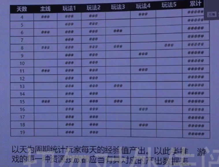 - 制定数据模型:建议在早期阶段就为每一个重要的资源制定出一个数据模型,可以用表格形式来规划和预设以经验值的产出为例,可以以天为周期,创建一个表格,记录玩家通过不同途径获得经验的量。