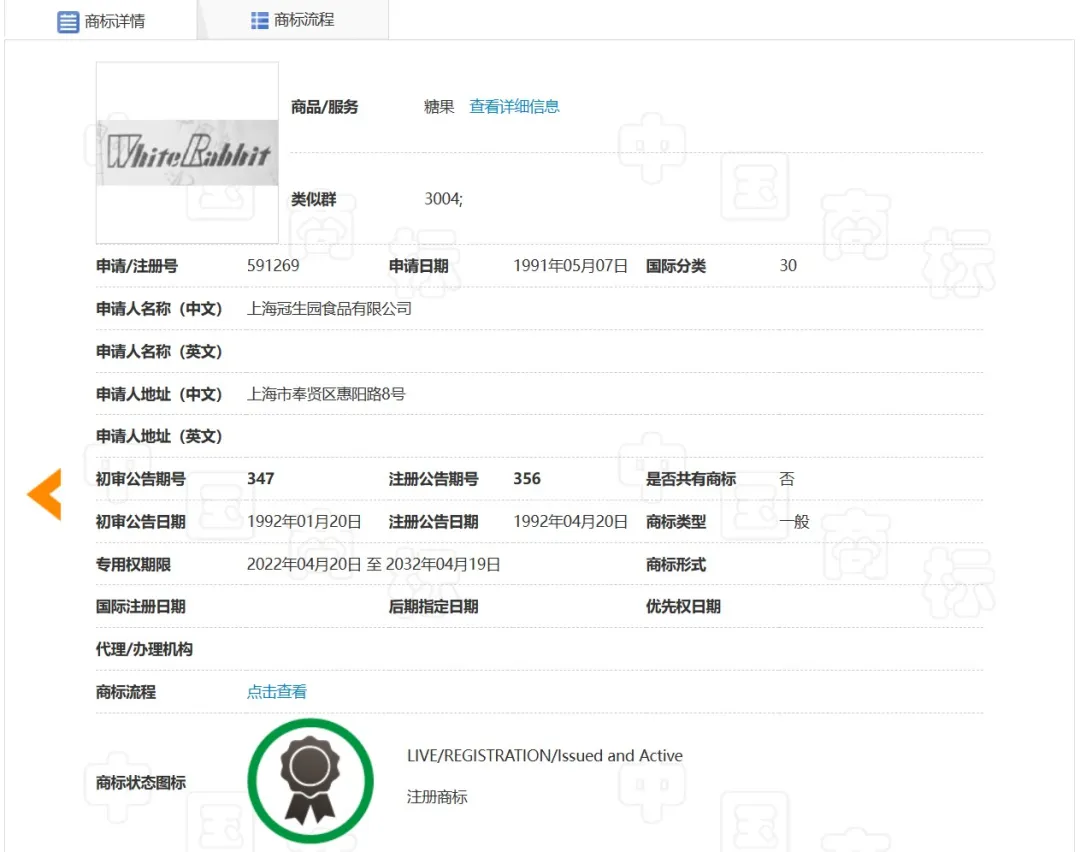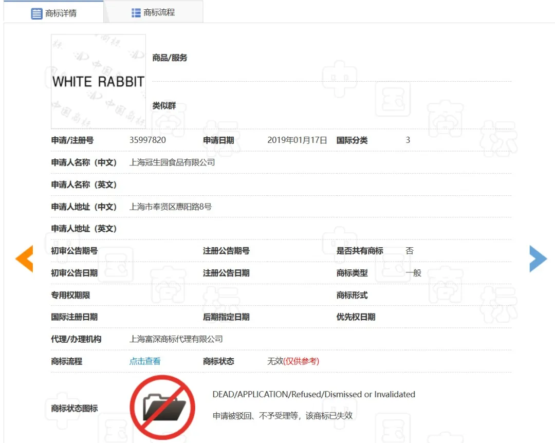 2019年,老字号“大白兔奶糖”和“气味图书馆”合作推出奶糖味香氛。但是,香水瓶上出现的的品牌标识非常简洁,除了大白兔图形,没有任何“大白兔”或“White Rabbit”的字样。原因在于,上海冠生园食品有限公司仅对White Rabbit在商标第30类“糖果”享有商标权,在第3类“香水”上的商标注册申请失败了。