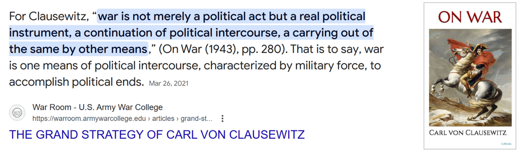 所以,第一类战争是君主国家战争,第二类战争是全面战争。这两类战争都符合Clausewitz(一位著名战争理论家)的理论——战争本质上是国家用来解决政治问题的一种工具。
