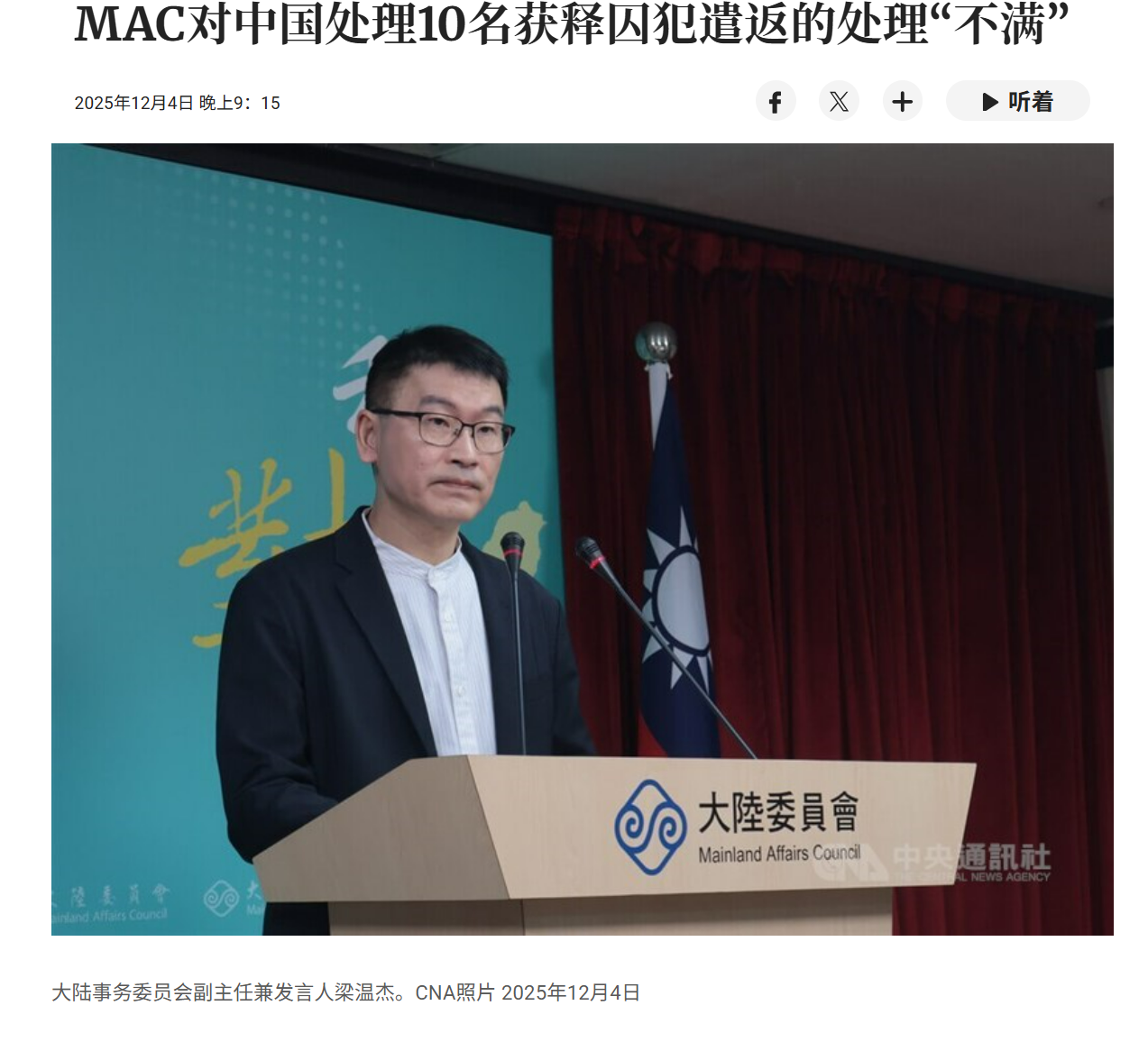 2025年12月,台湾方面再次抗议。大陆将10名在柬埔寨涉诈并在大陆服刑期满的台湾人遣返至金门。台湾陆委会对此表示不满,认为依据协议,遣返应经由“事前充分协商,核实身份,约定时间地点”,大陆的做法导致合作机制退化为陆方的“单边行政通知”。