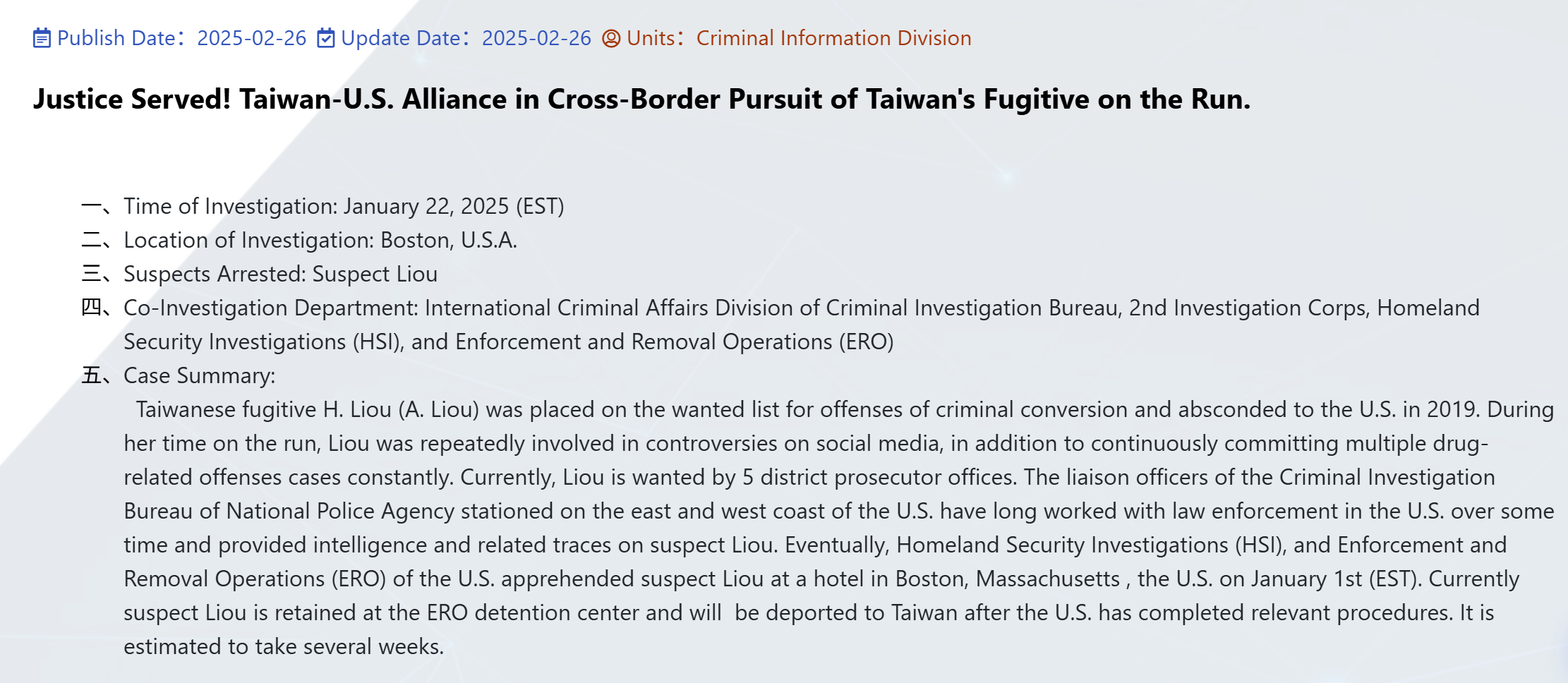 2016年何琇珍案是台美自1979年断交之后,首度成功利用移民法遣返通缉犯的案例。随后的林梅戎案(侵占公款)与刘乔安案(涉毒、诈欺)显示此模式已常态化。美国国土安全调查局(HSI)与移民及海关执法局(ICE)的ERO(执法与驱逐行动组)成为发挥作用的主要力量。例如,在刘乔安案中,美方依据台方通报其护照被注销且涉嫌在美从事不法活动,直接在波士顿将其逮捕并启动遣返程序。