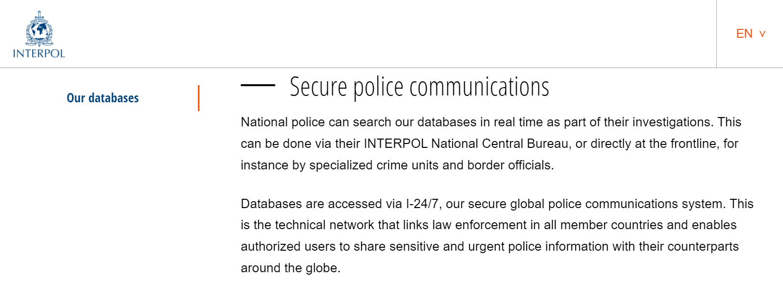 目前,INTERPOL的196个成员国通过I-24/7全球警察通讯系统进行即时情报分享。该系统允许各成员国的国家中心局(National Central Bureau,简称 NCB)在几秒钟内查询护照、指纹、DNA及红色通缉令(Red Notice)数据库。在INTERPOL的运作体系中,国家中心局是连接各国警方与国际刑警组织的中枢。每一个INTERPOL成员国都必须设立一个 NCB,接收并转办来自其他国家及INTERPOL总部的协查请求,完成跨境执法协调。