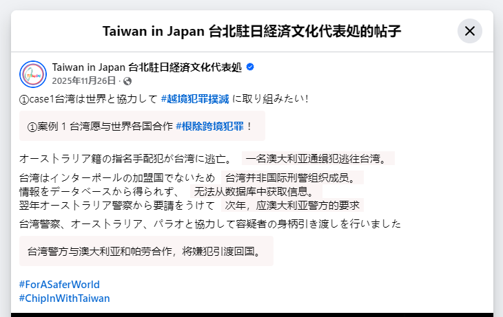 现实操作 | 日本警方通常在杀人、毒品等重罪上协助台湾。对于涉及政治的问题,不会由警察厅贸然表态。即使表态,也更可能是以“可能危害日本经济安全”或“申报不实”等理由拒绝入境,但不至于拘捕。 | ||||